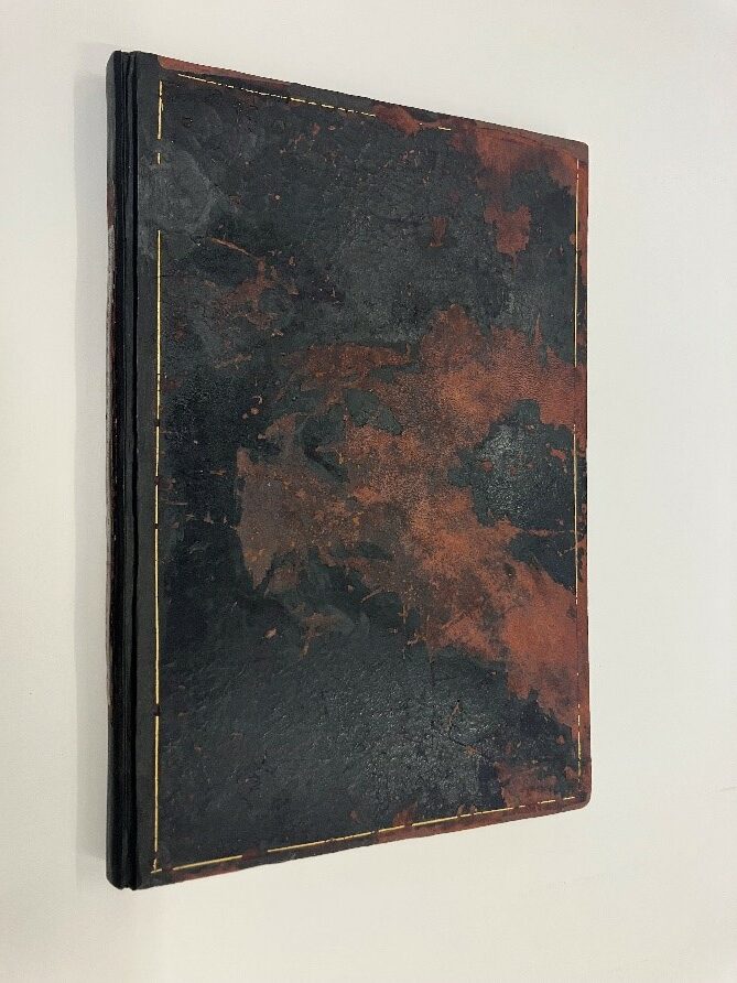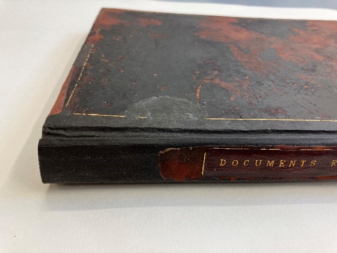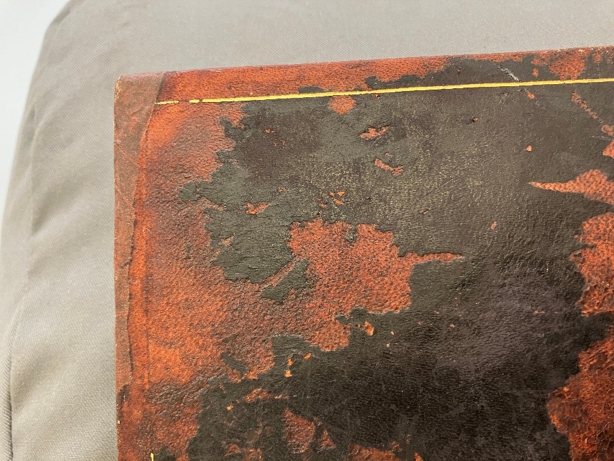 The leather on the covers was fragile and flaking. This was consolidated with adhesives. We repaired the split corners with more toned Japanese paper.