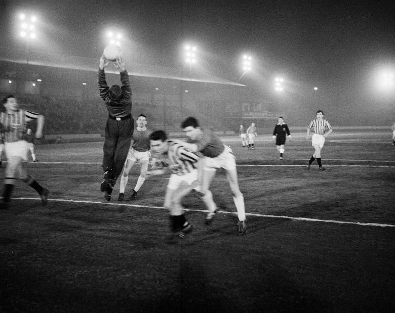 • Men playing football on a lit pitch in the dark. One person jumps to catch the ball.